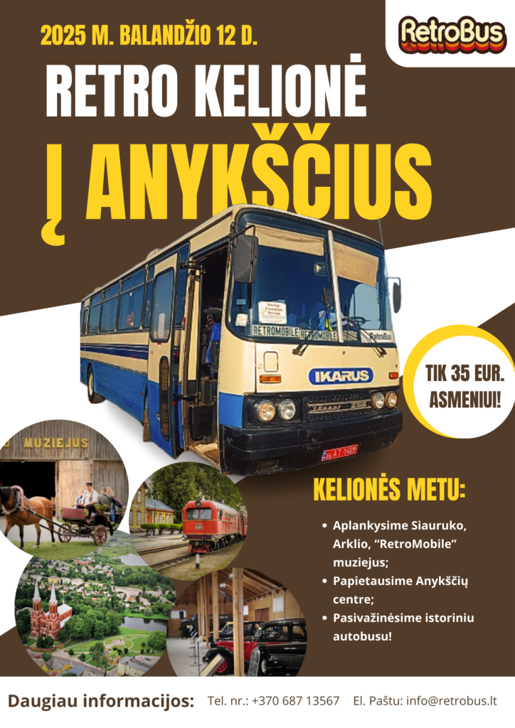 Atrask Lietuvą retro autobusu! Rinktis kelionę Sužinoti daugiau Autobusų nuomaSuteiksime išskirtinę patirtį Jūsų organizuojamai kelionei, šventei ar veiklai! Tai gali būti šimtadienis, įmonės vakarėlis ar net vestuvės! Kelionių organizavimasOrganizuojame autentiškas, retro keliones į Lietuvos miestus ir muziejus, sekite naujienas! RenginiaiDalyvaujame įvairiuose istorinio transporto išsaugojimo renginiuose ir ekspozicijose! Jau šiandien pradėkime kurti retro prisiminimus! Praėjusios kelionės